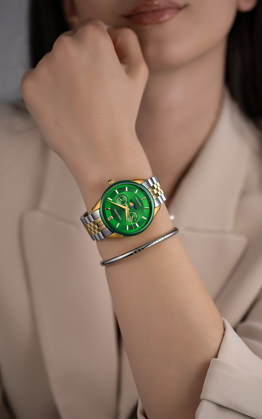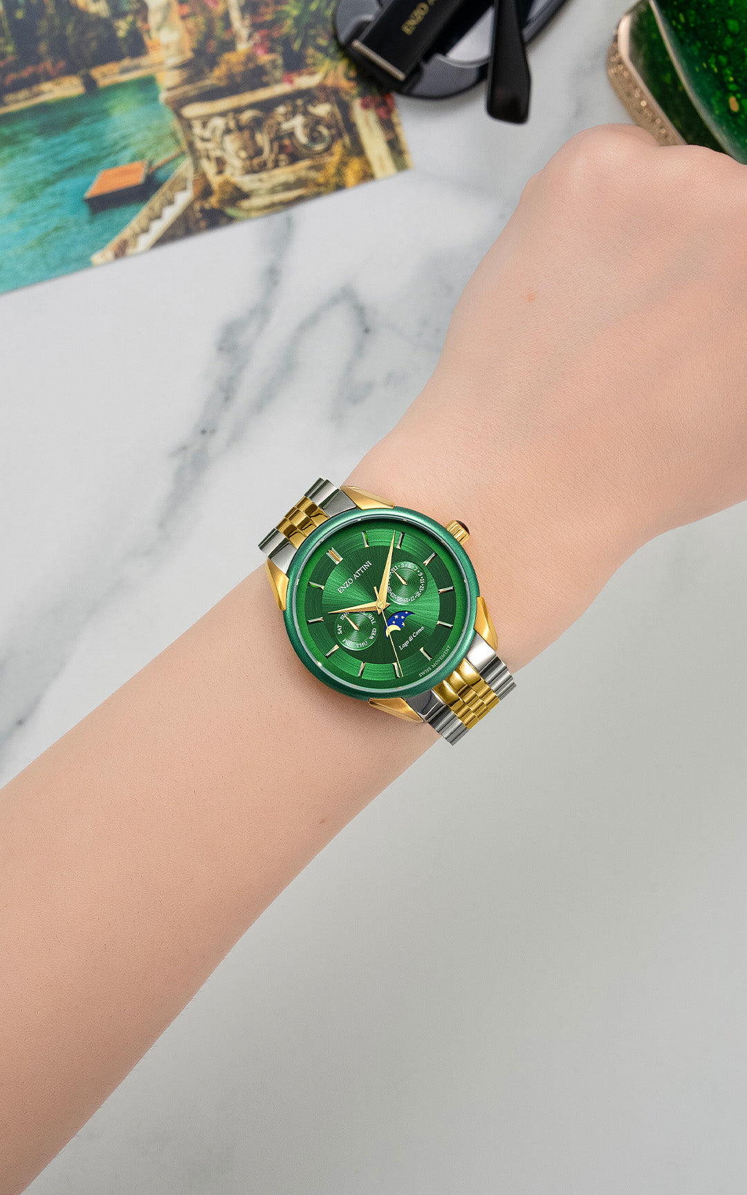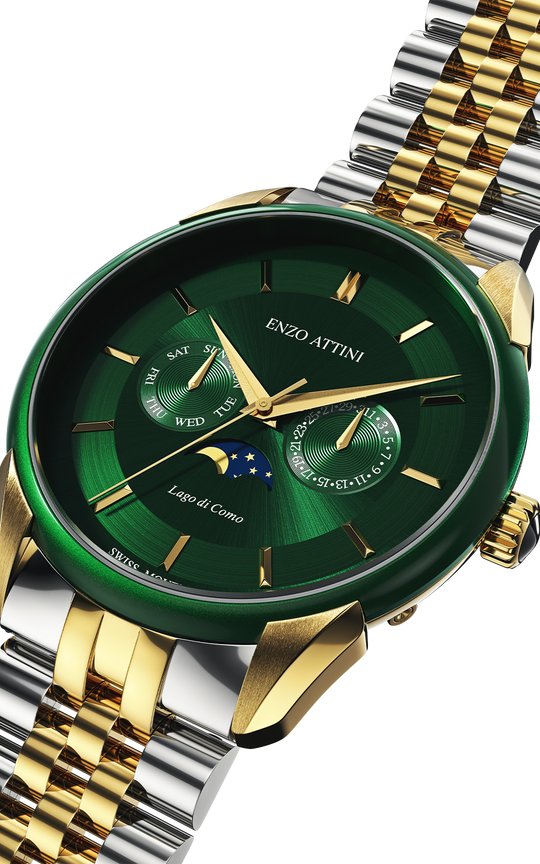 Case: Stainless steel 316L, green & gold color (plated with genuine 18K gold), 40mm x 8.9mm.