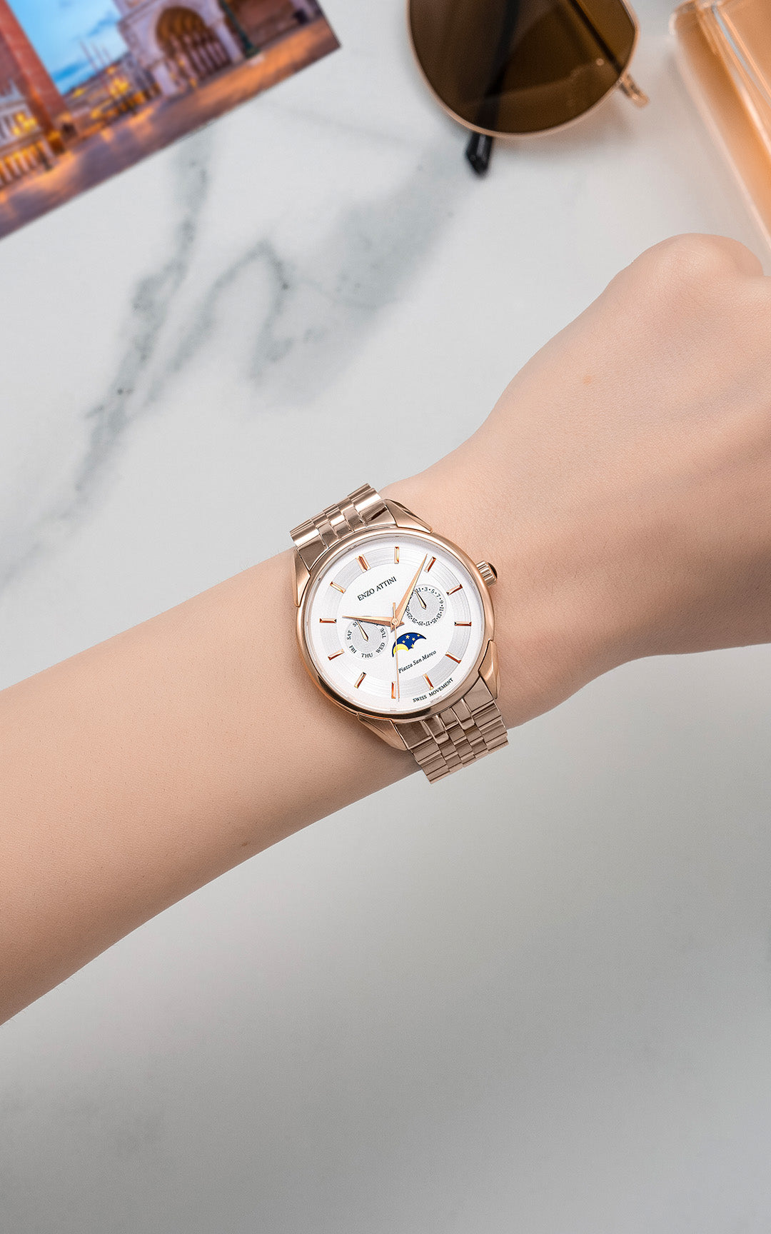 Case: Stainless steel 316L, rose gold color (plated with genuine 18K gold), 40mm x 8.9mm.