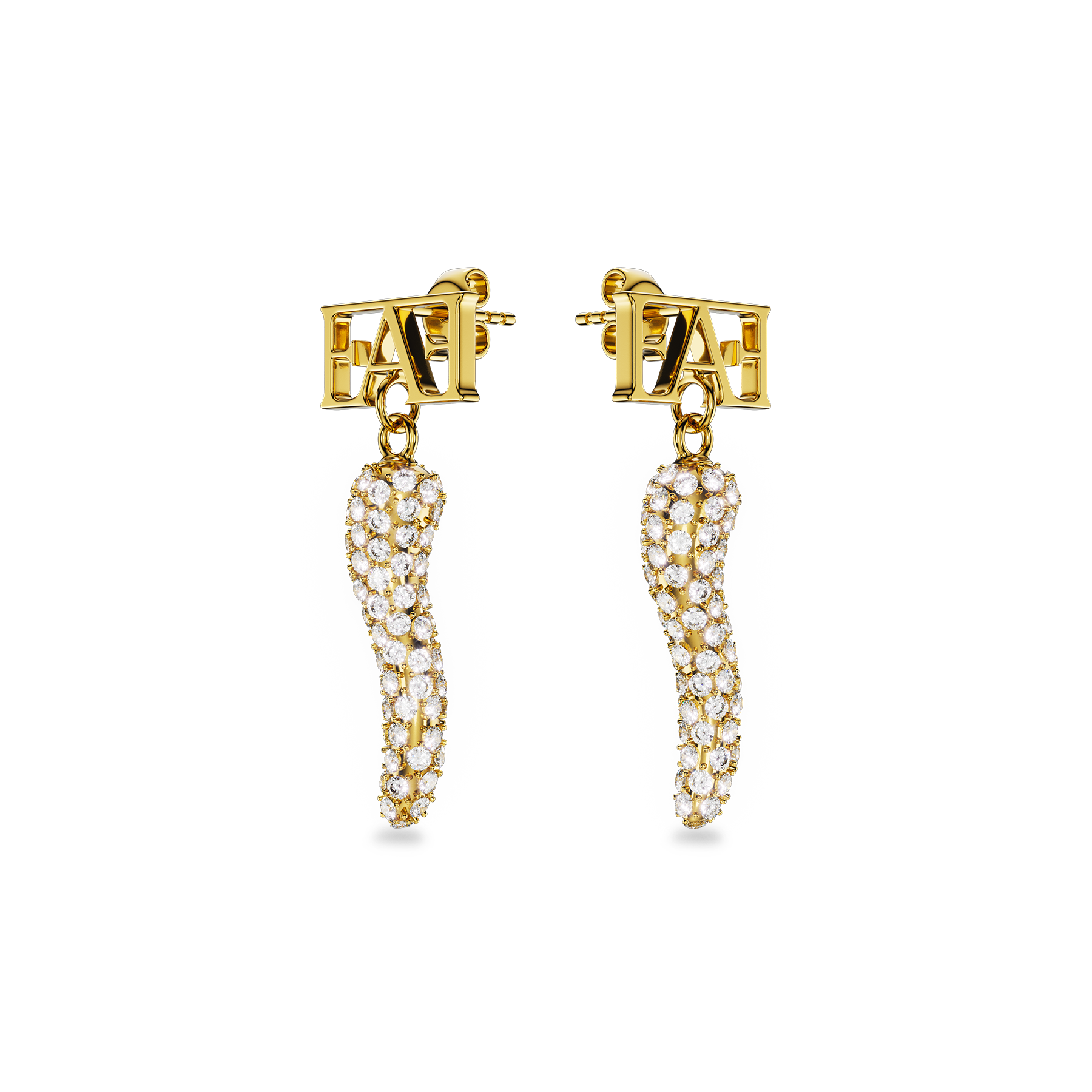 Cornicello Charm Earrings are a bold, modern take on an iconic symbol, designed to deliver refined luxury with a confident edge. The polished EA monogram stud creates a strong signature at the top, while the fully pavé-set cornicello charm drops below in a sleek, sculptural silhouette. With brilliant clear stones wrapping the entire form, the earrings catch light with a controlled, high-end sparkle that elevates any look instantly.