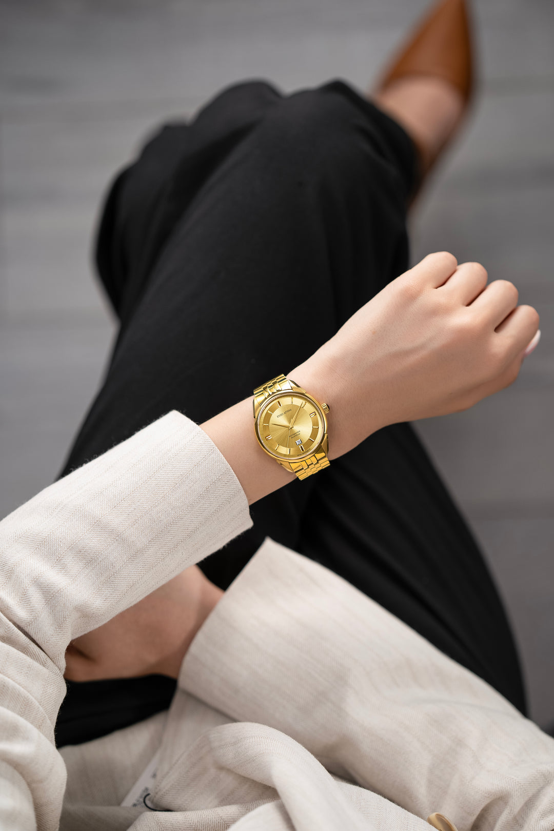 President Bracelet: Stainless steel 316L, gold color (plated with genuine 18K gold), fits wrists up to 22 cm.